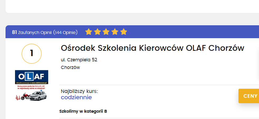 Według SuperPrawoJazdy.pl, OSK OLAF to najlepiej oceniania szkoła jazdy w Chorzowie. Kursanci chwalą profesjonalne podejście, cierpliwych instruktorów i przyjazną atmosferę, dzięki której nauka staje się przyjemnością. Wysoka zdawalność i liczne pozytywne opinie potwierdzają, że OSK OLAF to miejsce, w którym naprawdę warto rozpocząć swoją drogę po prawo jazdy.